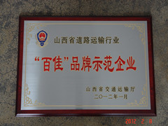 2012年2月8日,在山西省道路運(yùn)輸工作會(huì)議上,我公司獲得由山西省交通運(yùn)輸廳頒發(fā)的山西省道路運(yùn)輸行業(yè)《“百佳”品牌示范企業(yè)》榮譽(yù)稱號(hào)。