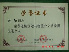 2013年4月2日,公司董事長(zhǎng)趙陽(yáng)在“道路貨運(yùn)與物流業(yè)立功競(jìng)賽”活動(dòng)中,被交通運(yùn)輸部辦公廳和中國(guó)海員建設(shè)工會(huì)全國(guó)委員會(huì)聯(lián)合授予“先進(jìn)個(gè)人”榮譽(yù)稱(chēng)號(hào)。