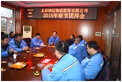 2015年2月19日,公司召開(kāi)春節(jié)團(tuán)拜會(huì)。公司總經(jīng)理胡永生代表董事會(huì)向全體職工及家屬送上誠(chéng)摯的春節(jié)祝福,同時(shí)各部門(mén)各分公司經(jīng)理也表達(dá)出對(duì)鋼運(yùn)物流的深切祝福。會(huì)后,總經(jīng)理助理尹躍飛、郝建國(guó)深入現(xiàn)場(chǎng)慰問(wèn)一線職工。