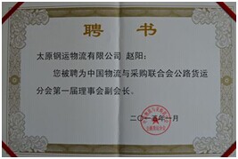 2015年3月5日受中國(guó)物流與采購(gòu)聯(lián)合會(huì)邀請(qǐng),公司總經(jīng)理胡永生赴上海參加中國(guó)物流與采購(gòu)聯(lián)合會(huì)公路貨運(yùn)分會(huì)一屆二次理事會(huì)。我公司被大會(huì)選為“中國(guó)物流與采購(gòu)聯(lián)合會(huì)公路貨運(yùn)分會(huì)副會(huì)長(zhǎng)單位”,公司董事長(zhǎng)趙陽(yáng)被聘為公路貨運(yùn)分會(huì)****屆理事會(huì)副會(huì)長(zhǎng)。