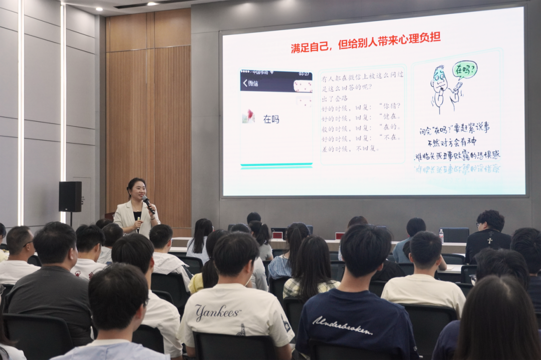 陳瑛老師的講座圍繞自我激勵、協(xié)同溝通、對外溝通、對上溝通四大維度展開。首先,陳瑛老師分別以工作場景和生活場景中的溝通對話與大家進行互動,帶領(lǐng)大家對“高情商”進行思考與剖析,由此展開當(dāng)天的主題。隨后,結(jié)合豐富的實戰(zhàn)案例與互動環(huán)節(jié),陳瑛老師層層遞進,深入淺出地講解了如何在日常工作中實現(xiàn)高效溝通,激發(fā)自我驅(qū)動力,提升團隊協(xié)同效能。在長達2.5小時的課程中,陳瑛老師還結(jié)合商務(wù)禮儀的要點,根據(jù)不同場景對溝通實操進行了解析。并強調(diào),良好的溝通不僅是技巧,更是一種心態(tài)與習(xí)慣的培養(yǎng),也是實現(xiàn)個人與團隊實現(xiàn)共同成長的重要途徑。